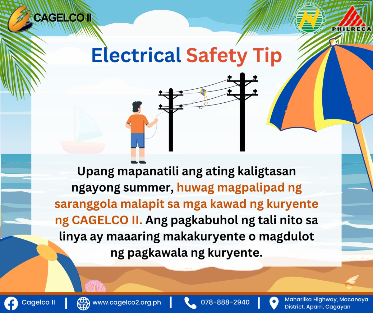 Upang mapanatili ang ating kaligtasan ngayong Summer, huwag magpalipad ng saranggola malapit sa mga kawad ng kuryente ng CAGELCO II. Ang pagkabuhol ng tali nito sa linya ay maaaring makakuryente o magdulot ng pagkawala ng kuryente. #CAGELCO2ElectricalSafetyTipForSummer
